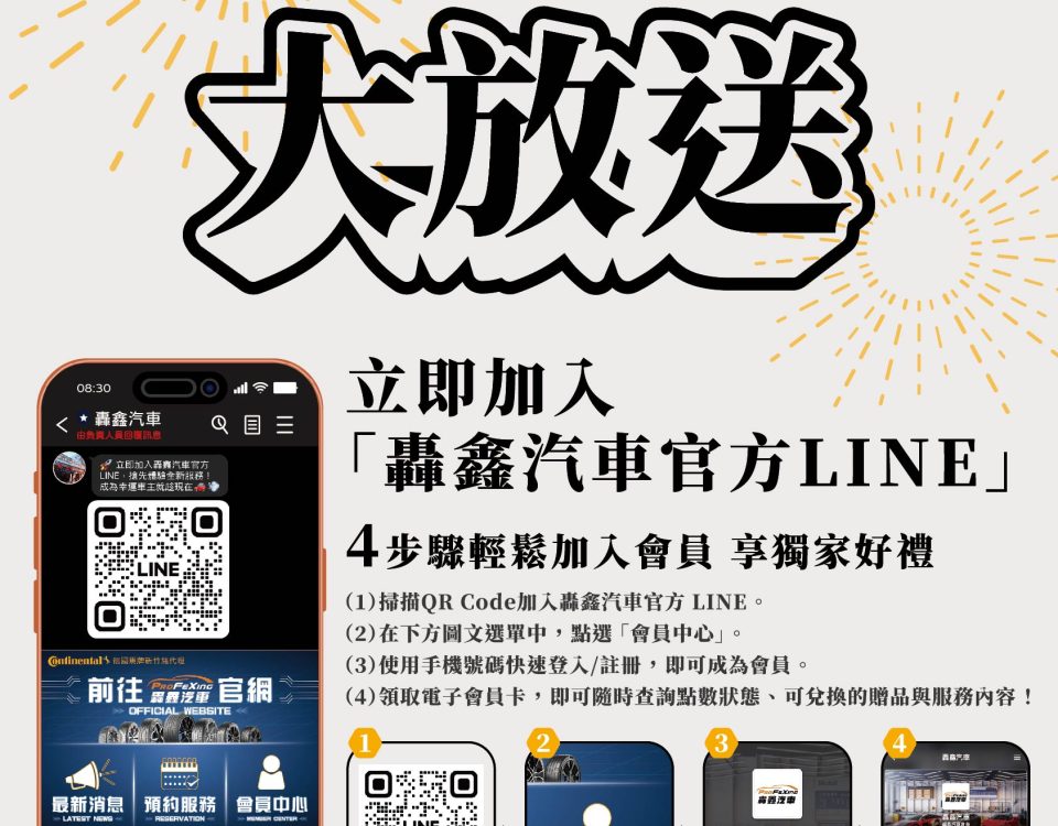 透過轟鑫汽車官方LINE ( ID:@profexing ) 圖文選單,加入OCard會員中心,消費集點兌換好禮或免費調胎服務!
